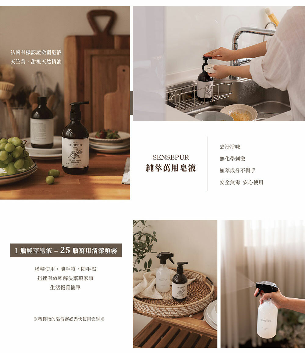 使用最安全且有機的原料,清潔力與多重功效,在使用皂液或稀釋噴霧時,沒有侵略性地刺激五官的不適,而是會把這淡淡的氣味變成一個家的味道。